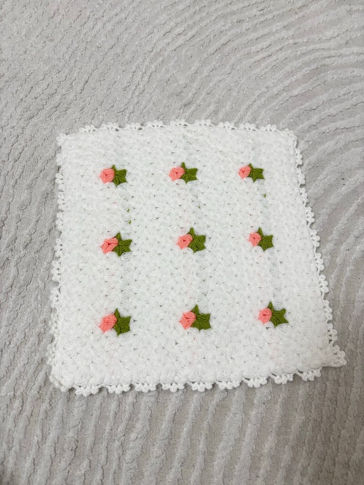 El yapımı beyaz banyo süngeri, küçük pembe ve yeşil çiçek detaylarıyla yumuşak dokuludur. Nazik kullanım için uygundur.