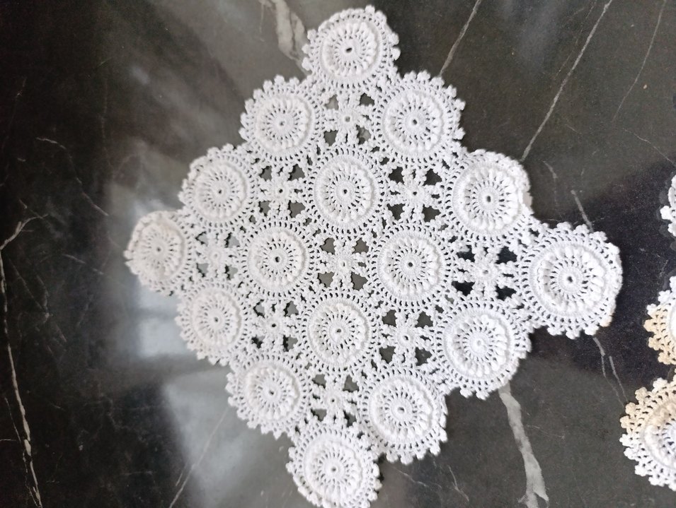 El yapımı beyaz dantel örtü, dairesel desenler ve ince detaylarla bohem tarzda hazırlanmıştır. Dekorunuza nostaljik bir dokunuş katıyor.