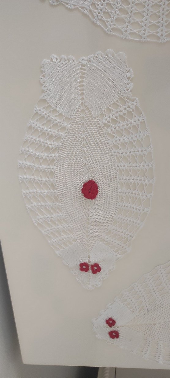 Bohem tarzda el yapımı beyaz dantel örtü, ince desenler ve küçük kırmızı çiçek detaylarıyla.