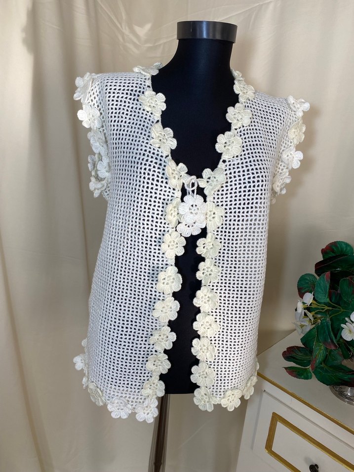 El yapımı krem renk örgü yelek., Zarif çiçek desenleriyle bohem tarzda. İnce işçilik doğal ve sanatsal bir hava katıyor.