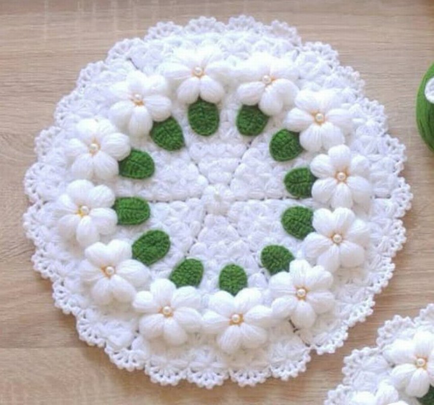 Yumuşak yeşil yapraklar ve incili beyaz çiçeklerle el yapımı geleneksel beyaz örgü