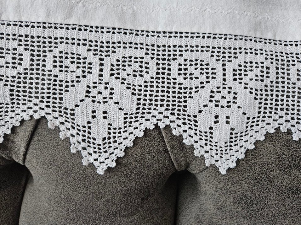 tek tarafı El yapımı beyaz dantel örtü, geleneksel çiçek desenine ve zarif dalgalı kenara sahiptir.