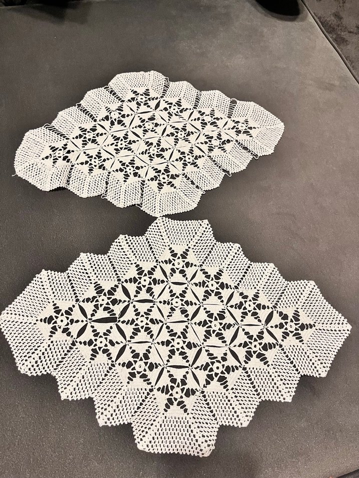 El yapımı beyaz dantel masa örtüleri, detaylı çiçek desenleri ve dalgalı kenarları ile klasik bir dokunuş sunar.