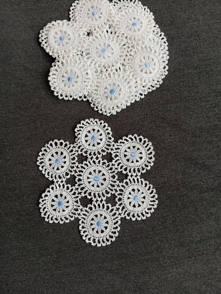 Mavi detaylı beyaz el yapımı dantel motifler. Geleneksel el işçiliğiyle hazırlanmıştır. Dekorasyon veya el işleri için uygundur. bir tanesinde çok hafif bir leke var. 18 x 18 cm