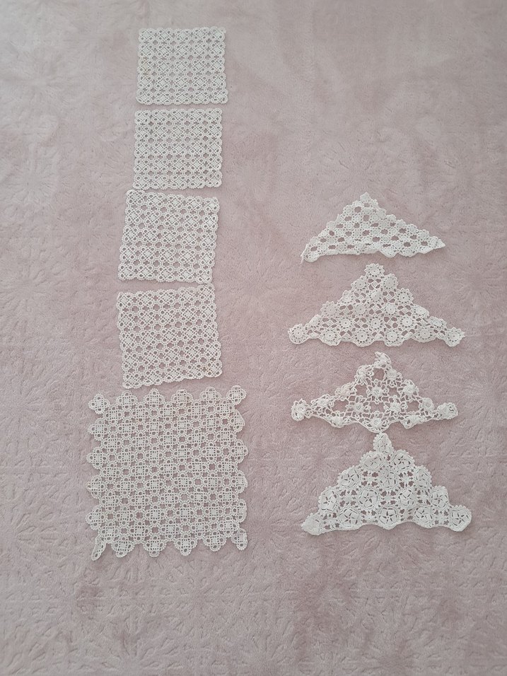 Kare ve üçgen şekillerde, ince işçilikle yapılmış el yapımı beyaz dantel motifler. Dekoratif el işleri için uygundur.