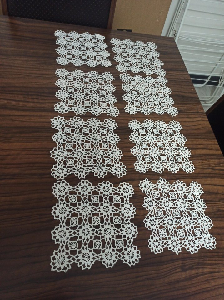 Sekiz adet el yapımı beyaz dantel motif, ayrıntılı çiçek desenleriyle süslenmiş, dekoratif el işleri için uygun.
