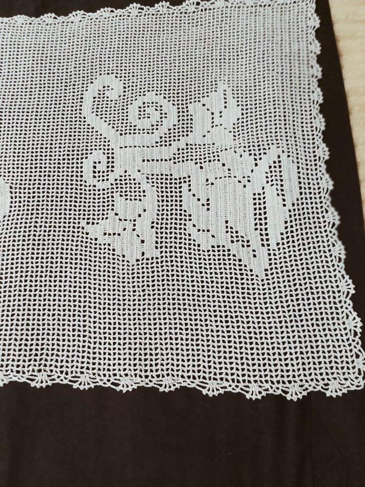 El yapımı beyaz dantel örtü, çiçek motifi ve geleneksel tığ işi detayları ile çevrilmiş kenarlara sahiptir.