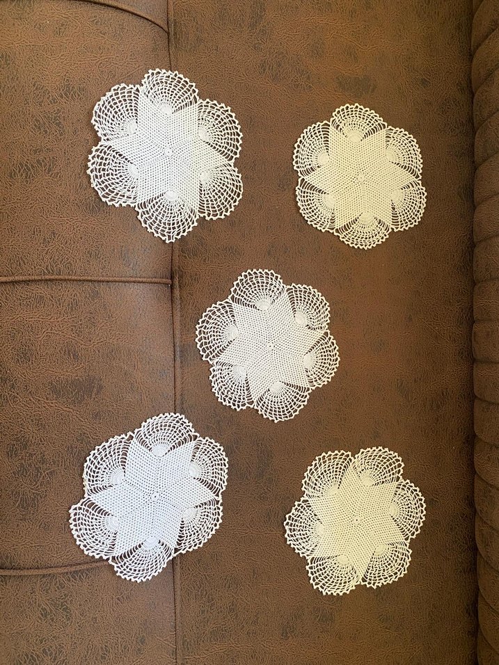 Beş adet el yapımı beyaz dantel çiçek desenli nihale seti, masanıza zarif bir dokunuş katar.