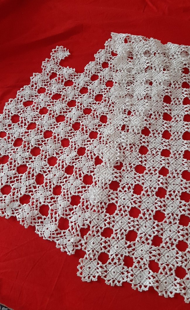 El yapımı beyaz dantel örtü, detaylı açık iş deseniyle zarif bir görünüm sunar.