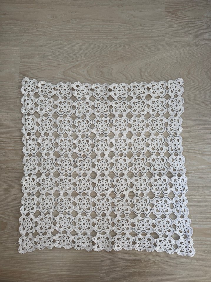 Tığ ile örülmüştür. Büyük olanın eni ve boyu 45cmdir. Küçük olanlar 10 tanedir. Ölçüsü 20cmdir. İsteyen birleştirip büyük masa örtüsü yapabilir yada ayrı ayrı kullanabilir.