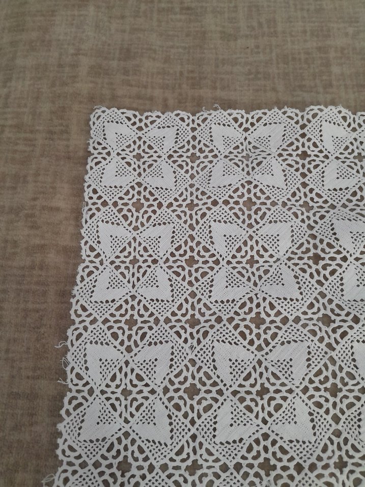 El yapımı beyaz dantel örtü, geleneksel motiflerle zarif bir desen sunar. çok çok az kullanıldı hiçbir sıkıntısı yok