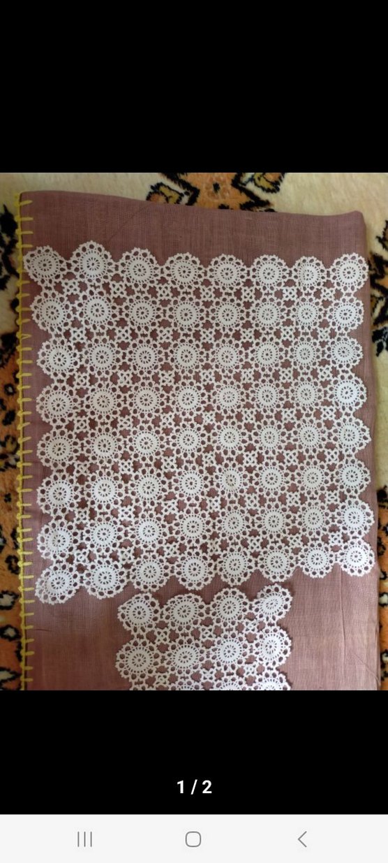 El yapımı beyaz dantel örtü, detaylı dairesel desenlere sahip ve kahverengi kumaş üzerine sarı dikişlerle tamamlanmıştır.