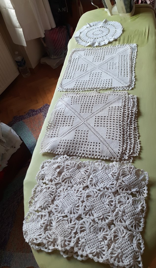 İki adet beyaz el yapımı dantel örtü, detaylı örme desenlere sahip, dekoratif kullanım için uygun. çeşitli boy ve ölçülerde örtüler.13 tane. kullanılmış ve yıkanmıştır yeni değiller
