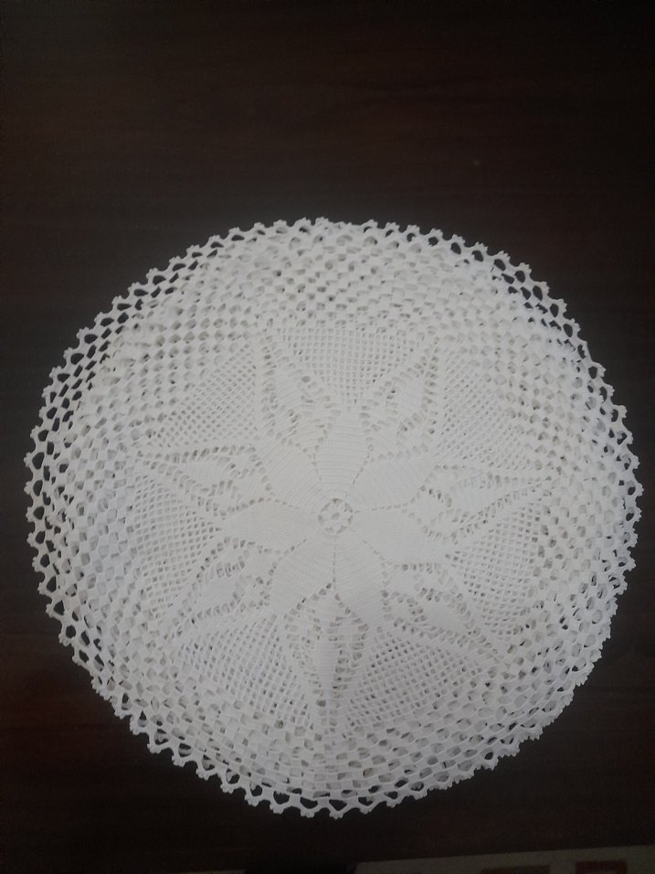 El yapımı beyaz dantel yuvarlak masa örtüsü, çiçek desenli ve ince işçiliklidir. Dekorunuza geleneksel bir dokunuş katar.