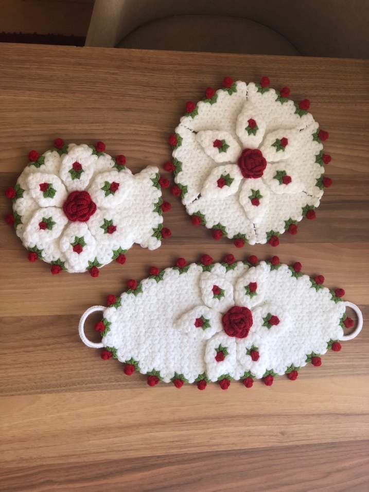 Kırmızı çiçek detaylı, beyaz el örgüsü set. Yuvarlak ve oval parçalar, kulplu, yumuşak dokulu. Çeyizlik set