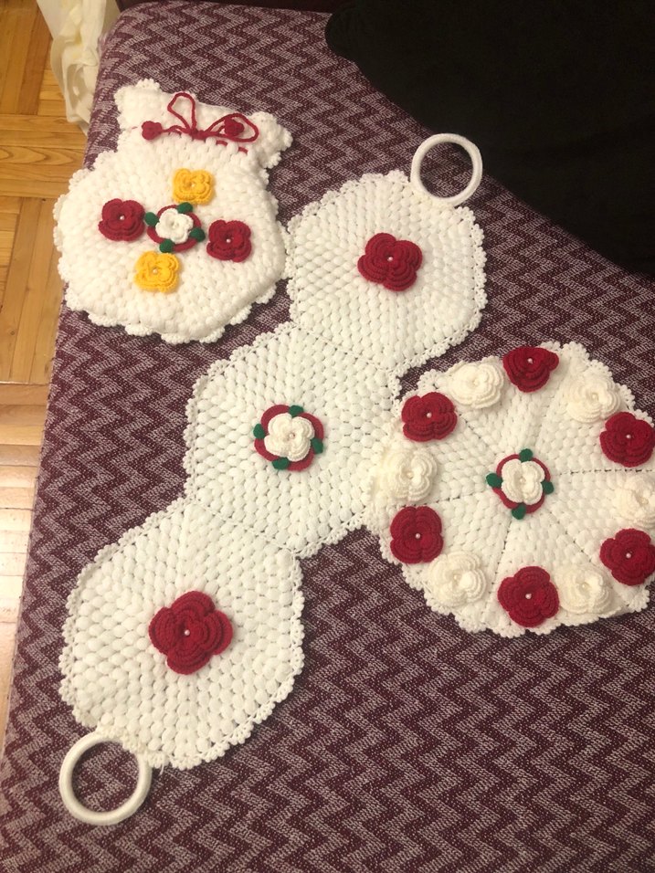 El Yapımı Beyaz Kırmızı Çiçekli Örgü Set