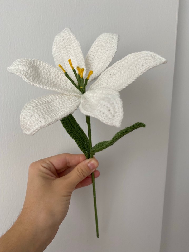 Detaylı yapraklara ve yeşil saplı el yapımı beyaz örgü zambak çiçeği, bohem dekor için uygun .