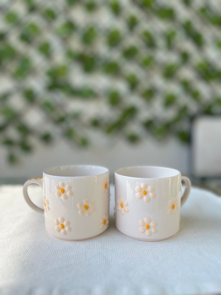 El Yapımı Beyaz Pastel Papatya Desenli Seramik Kupa
