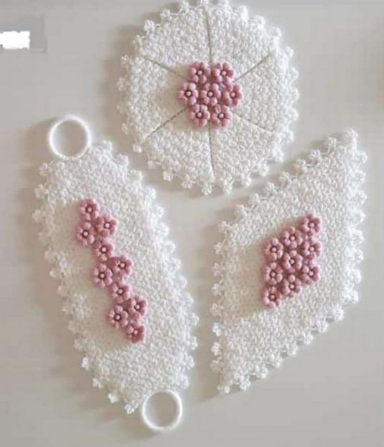 Üç beyaz örgü parça, pembe çiçek motifleriyle süslenmiş, geleneksel el işi tarzında. el yapımı sipariş alınır
