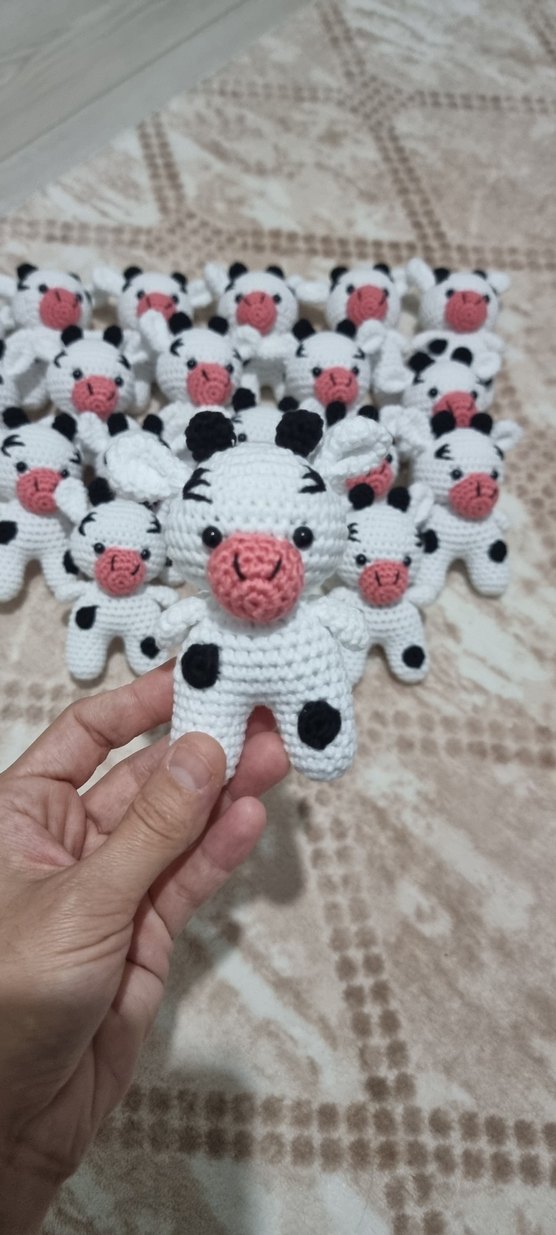 El yapımı, beyaz renkte peluş oyuncak. Siyah benekli ve pembe burunlu küçük inek tasarımıyla renkli detaylara sahip.