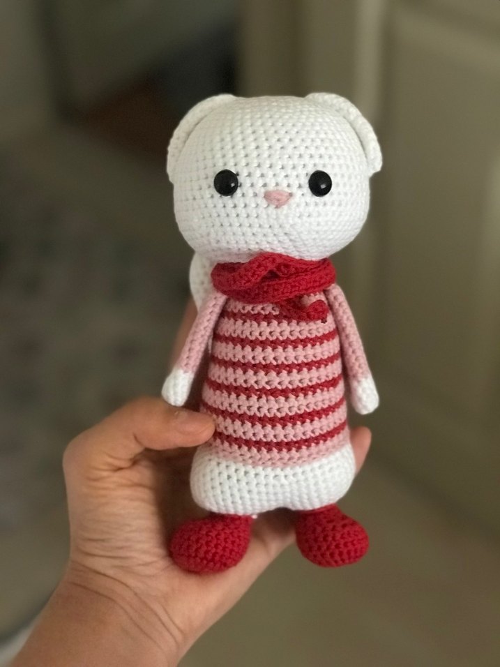 El yapımı renkli çizgili kıyafet ve kırmızı ayakkabılarla gelincik. Yumuşak ve detaylı tığ işi tasarım. el yapımı amigurumi oyuncak