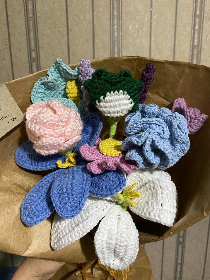 Renkli tığ işi çiçekler ve küçük kurbağa detayıyla el yapımı bohem tarzda solmayan çiçek buketi.
