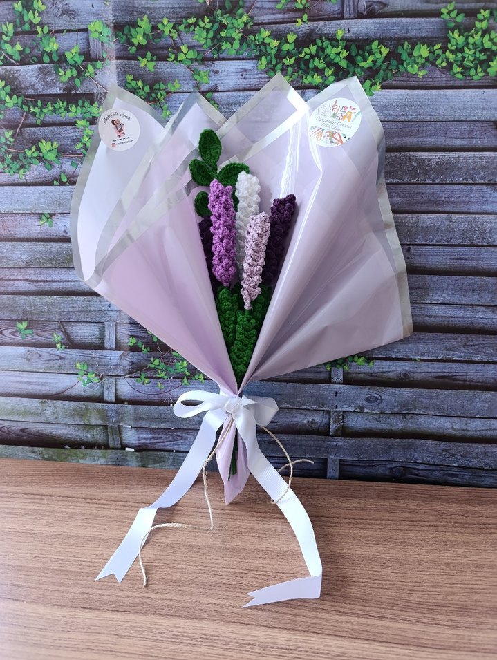 El yapımı bohem tarzda, mor ve beyaz tığ işi çiçeklerden oluşan, şeffaf kağıt ve beyaz kurdele ile sarılı buket.