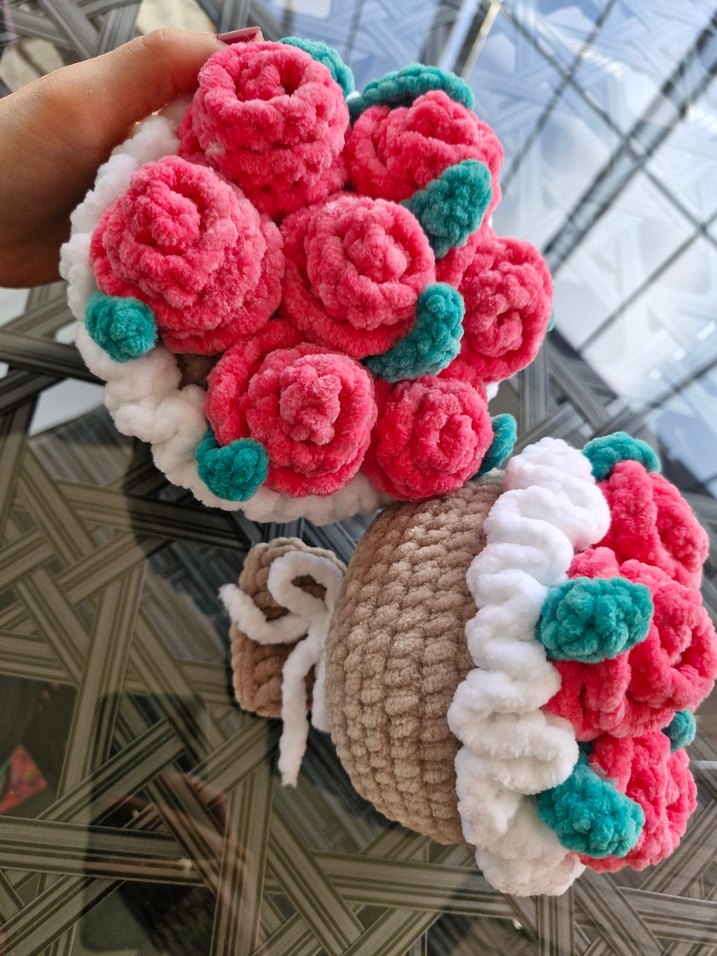 Canlı pembe ve turkuaz detaylı, el yapımı bohem tarzda örgü çiçek buketi. Yumuşak dokusu ile dekorasyona şık bir dokunuş katıyor.