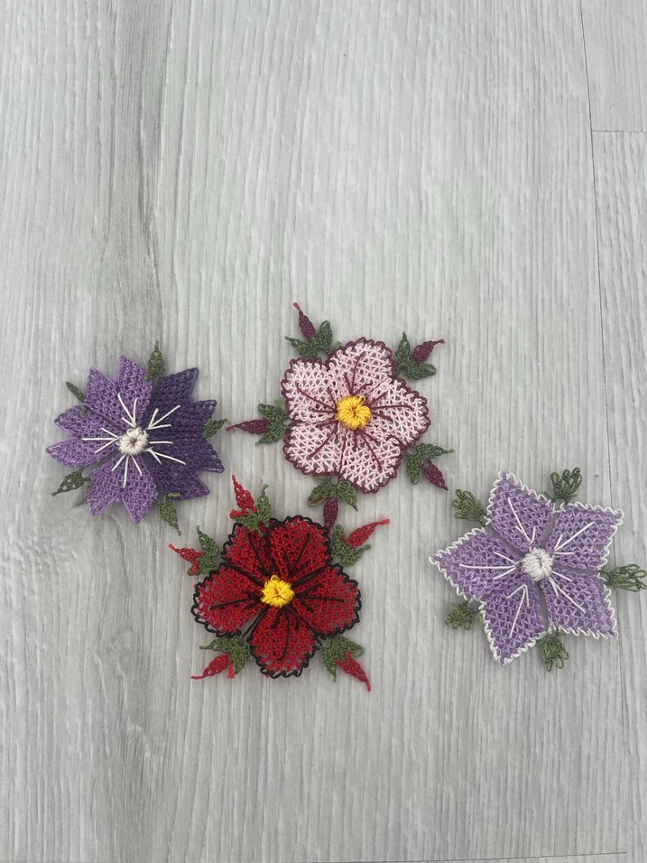 El yapımı, bohem tarzda çeşitli renklerde detaylı işçilikle hazırlanmış çiçek motifleri. Dekoratif kullanım için uygundur. Tane olarak satılır havlu ve mevlüt örtüsünr uygun