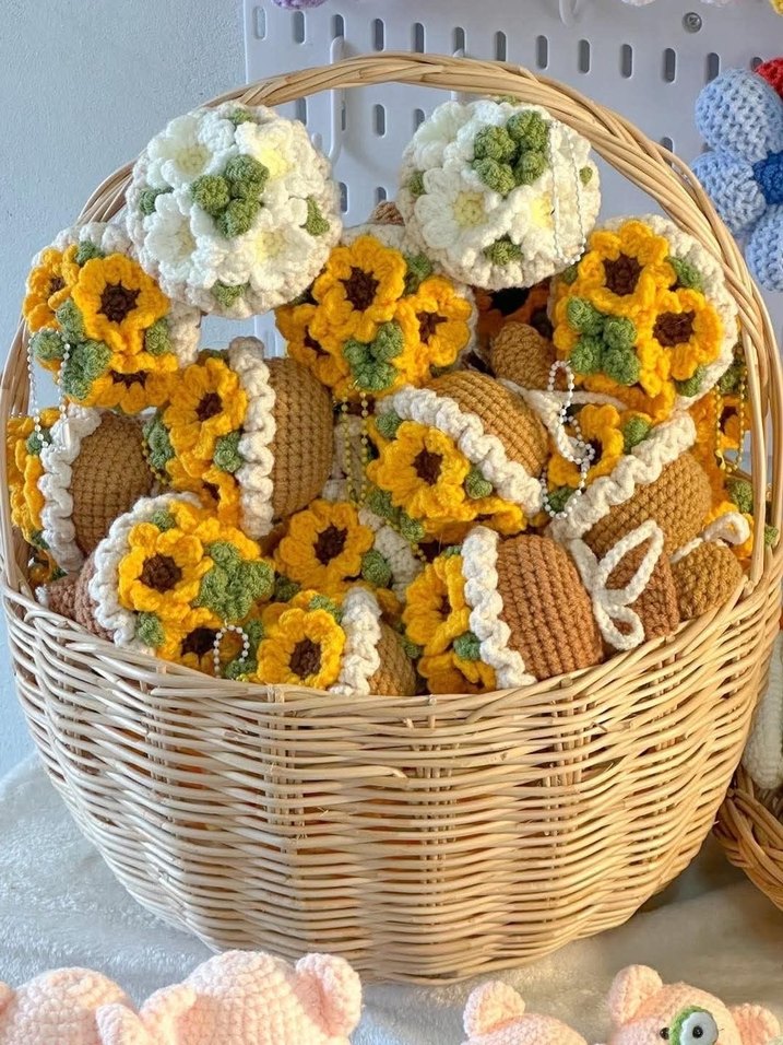 Sarı ve beyaz renklerde el yapımı, bohem tarzda tığ işi çiçeklerle süslenmiş anahtarlıklar, hasır sepet içinde sunuluyor.