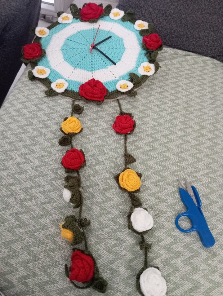 Kırmızı, sarı ve beyaz tığ işi çiçeklerle süslenmiş, turkuaz ve beyaz yuvarlak tabanlı el yapımı bohem duvar saati. En güzel hediye en güzel çiçeklerle bezenmiş evinizi balkonunuzu senlendirecek istenilen renklerde yapılır