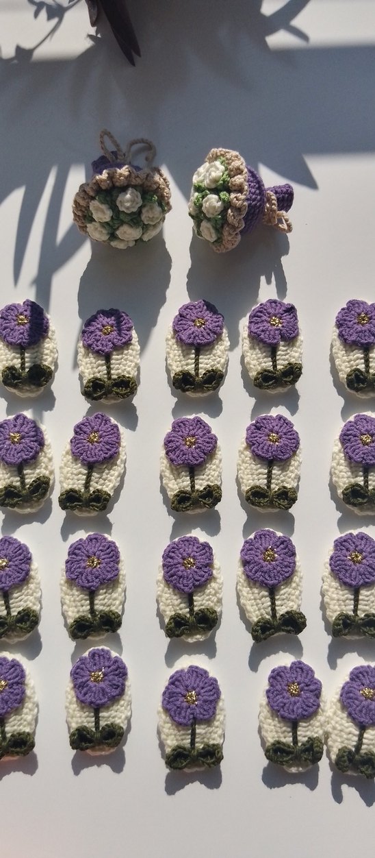 El yapımı bohem tarzda, mor ve krem renkli çiçek desenli örgü tokalar. Her parça detaylı çiçek motiflerine sahiptir. 5 cm çıtçıt toka üzerine yapılmıştır. 3-5 iş günü içinde kargoya verilir. Sipariş üzerine üretilmektedir.