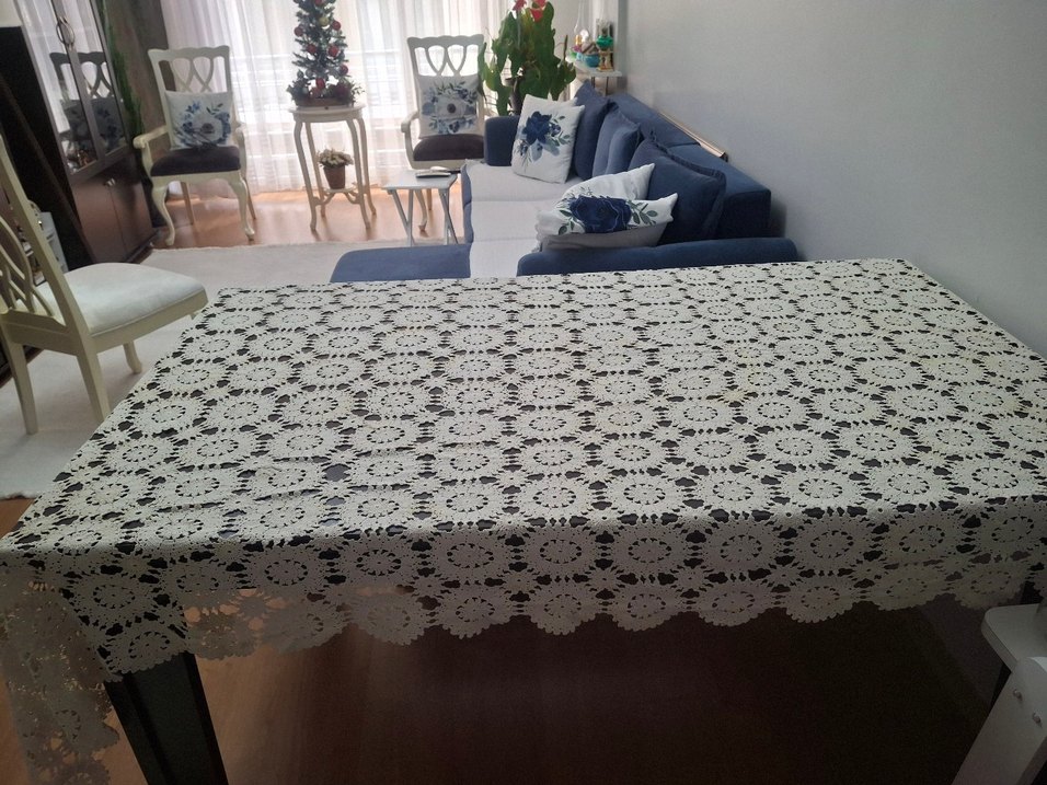 El yapımı bohem dantel masa örtüsü, detaylı yuvarlak desenlerle masanıza zarif bir dokunuş katıyor.