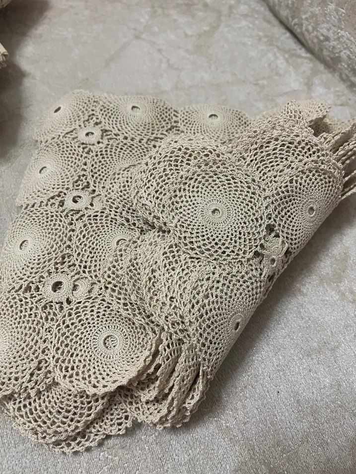 El yapımı, dairesel desenlere sahip bohem dantel örtü, ince iplikle işlenmiş dokulu bir görünüm sunar 20 parça vitrinmiçi bir tane sehpa örtüsü toplam 21 parça el emeği dantel .