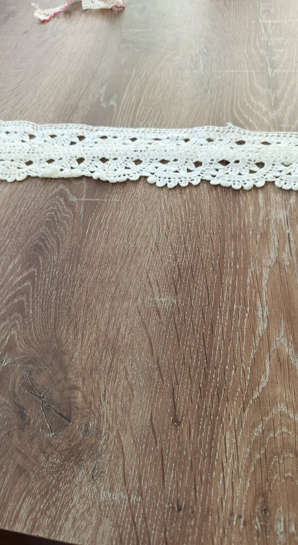 El yapımı bohem dantel şerit, ince desenlerle süslenmiş. Yumuşak dokusu ve zarif tasarımıyla dekoratif el işleri için uygundur.