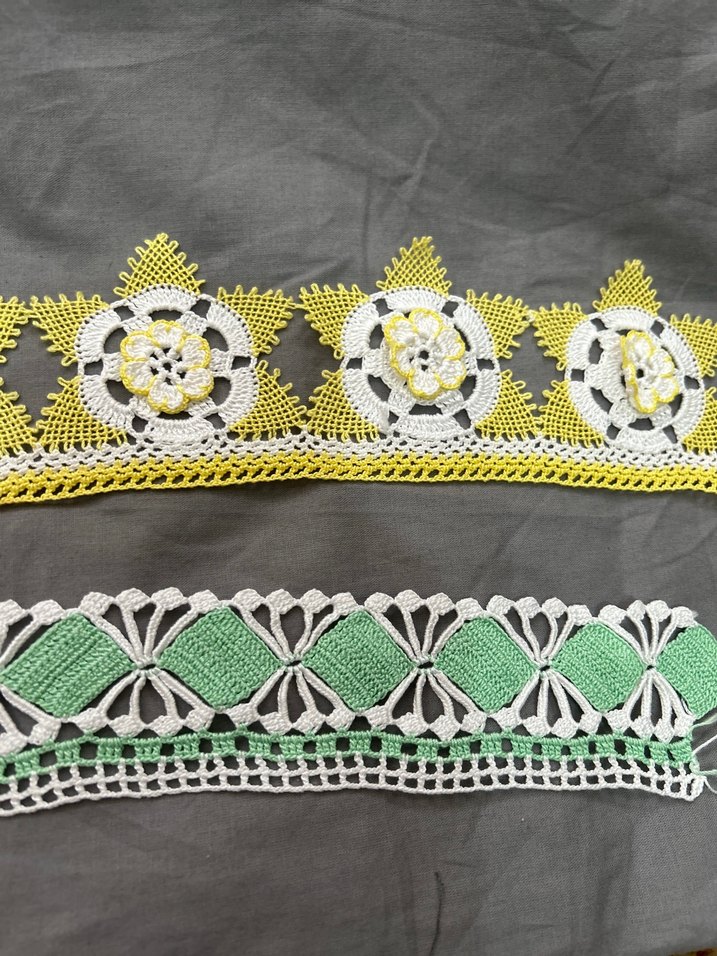 Sarı, beyaz ve yeşil renklerde el yapımı bohem dantel şeritler, detaylı desenlere sahip. Dekoratif el işleri için uygundur.
