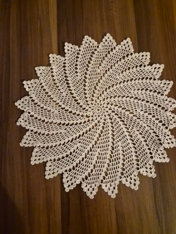 El yapımı bohem tarzda, spiral desenli yuvarlak dantel masa örtüsü. Yumuşak, doğal iplikten yapılmıştır. çarkıfelek şeklinde örtüler el emeği çeyizlik ürün sandıktan çıkarıldı ebat :24cm adet:6 bobin ipinden yapıldı kolay kolay kırışmaz
