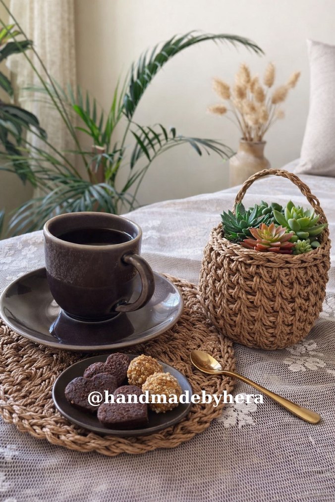 Bohem tarzda, elde örülmüş saplı hasır sepet ve uyumlu yuvarlak Amerikan servis seti. @handmadebyhe.r imzalı el işçiliğiyle öne çıkar. Sunum altlığı çap 15 cm sepet çap 8 cm yükseklik 7 cm uzunluğunda dır