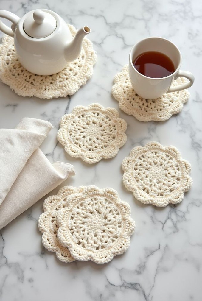 İçeceklerin altına konan, el yapımı ve bohem tarzda örülmüş detaylı dantel altlıklar seti.