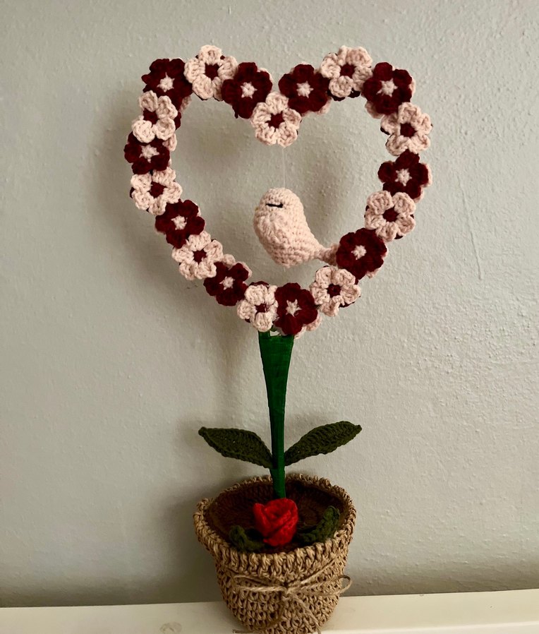 El yapımı bohem tarzda kalp şeklinde tığ işi çiçekler ve içinde küçük bir kuş bulunan dekoratif süs, örgü saksıda.