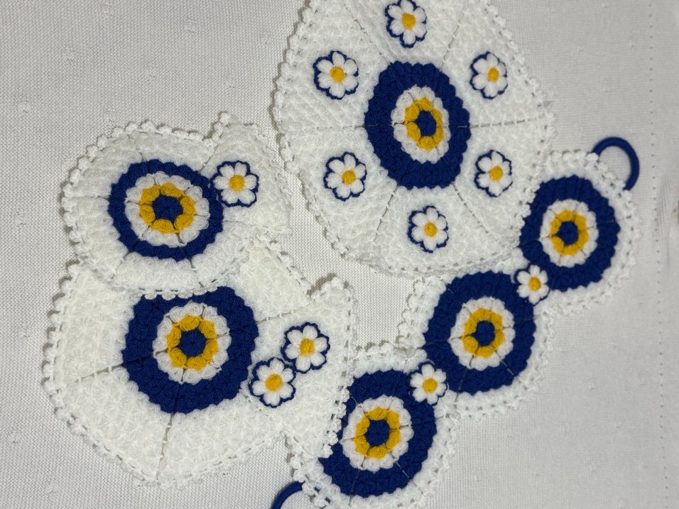 Yumuşak iplikle yapılmış, beyaz, mavi ve sarı renklerde bohem çiçek motifli el yapımı örgü süsler. 4 lü takım olarak satıyorum