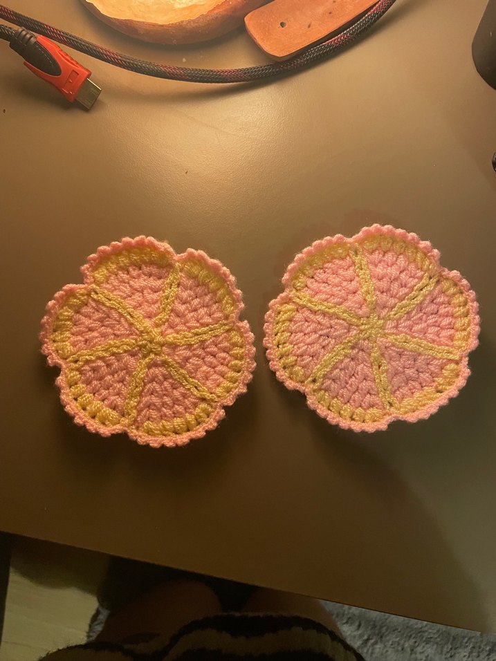 Pembe ve sarı renklerde, çiçek desenli el yapımı bohem örgü bardak altlıkları. Masanıza sıcak bir dokunuş katmak için ideal.