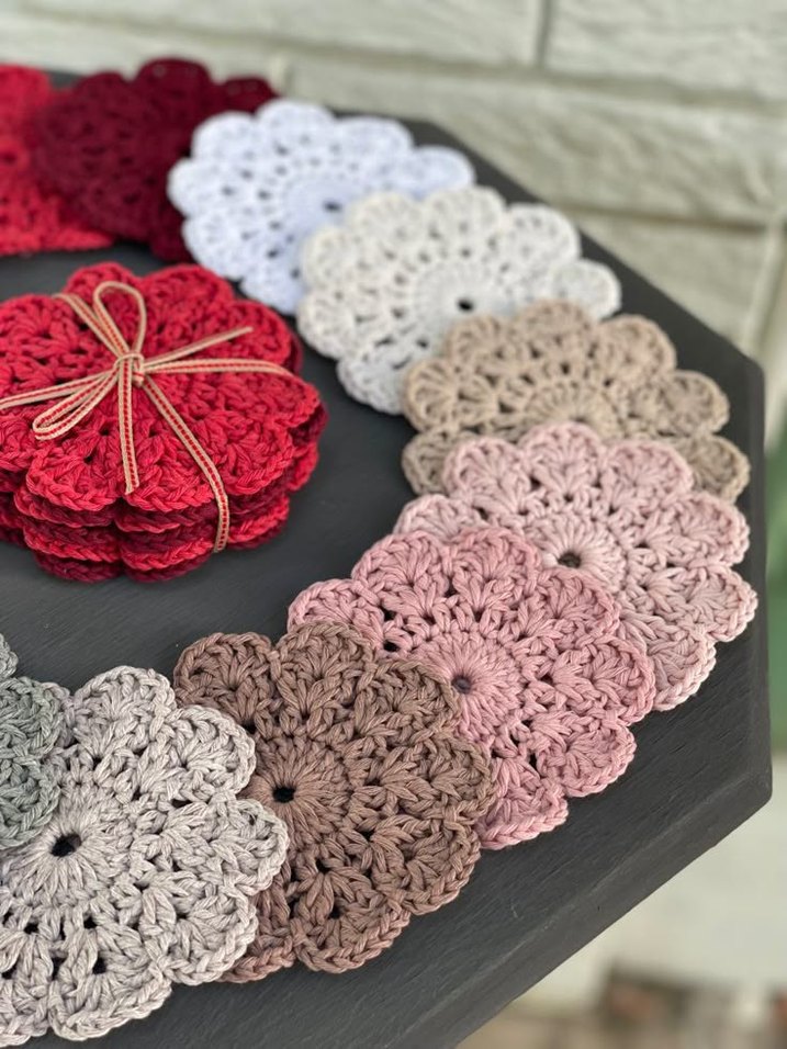 Farklı renklerde, çiçek desenli el yapımı bohem örgü bardak altlıkları. Masanıza sıcak bir dokunuş katmak için ideal.