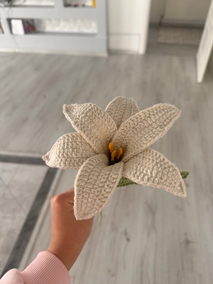 Yumuşak dokulu iplikle el yapımı, krem rengi yaprakları ve sarı detayları olan bohem tarzda örgü çiçek. #örgü #çiçek