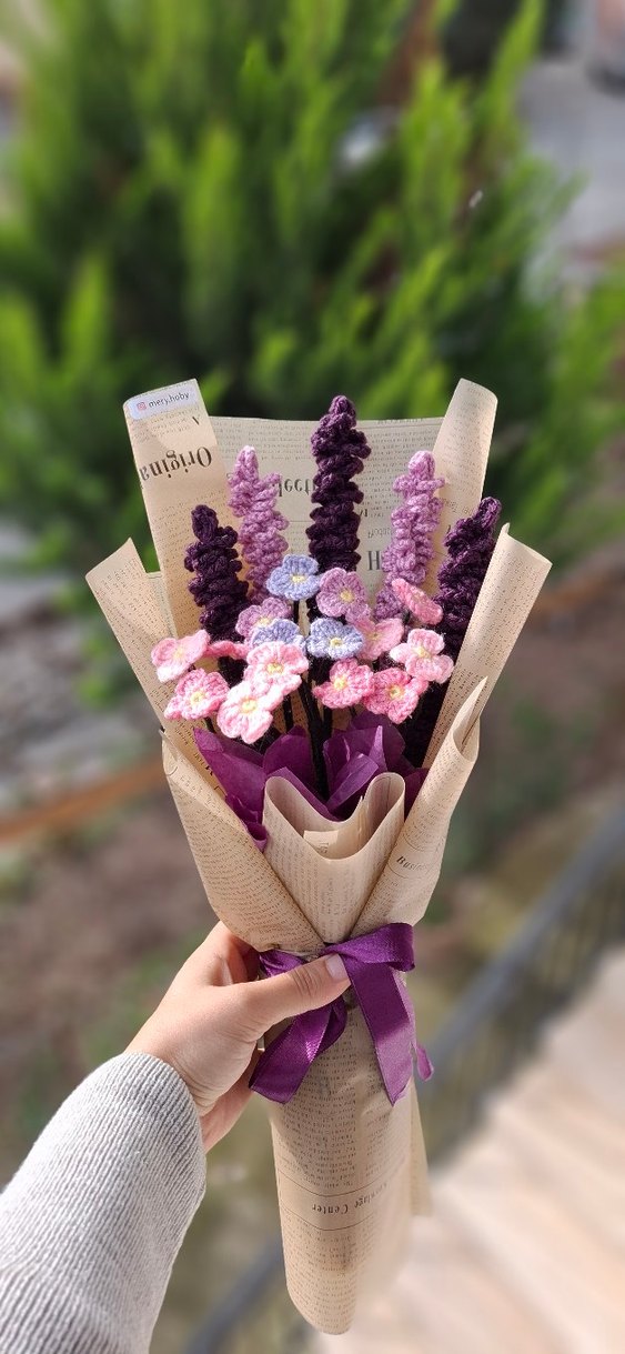 El yapımı bohem tarzda, mor ve pembe tonlarında örgü çiçeklerden oluşan, vintage tarzı kağıda sarılı ve uyumlu kurdeleyle bağlanmış buket.