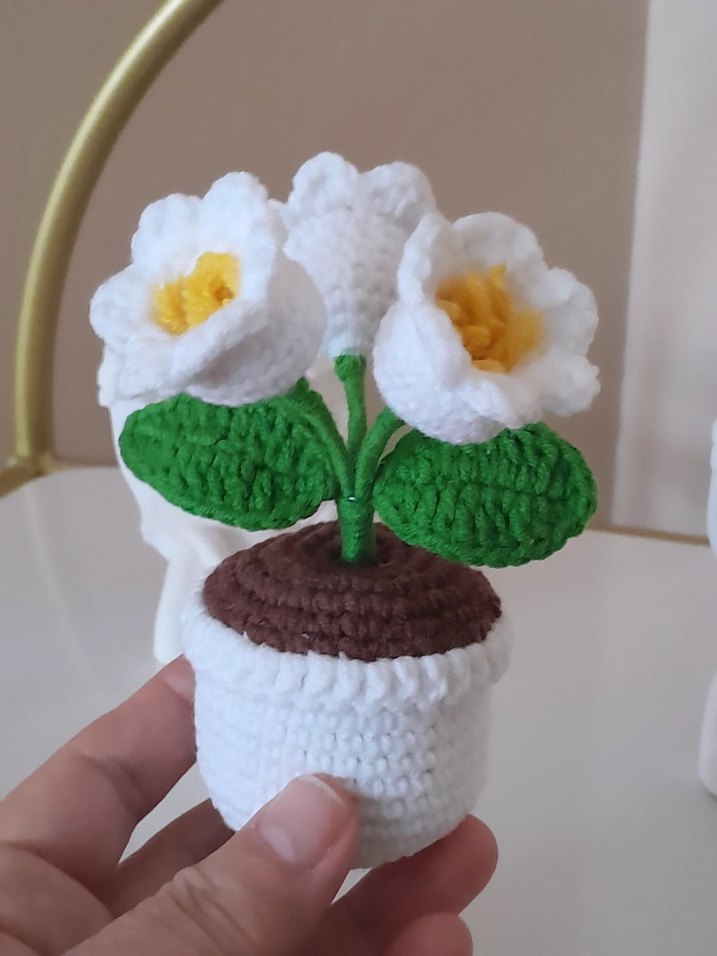 Beyaz yapraklı ve yeşil yapraklı el yapımı bohem örgü çiçek dekoru. Küçük saksıda doğal bir dokunuş sağlar .