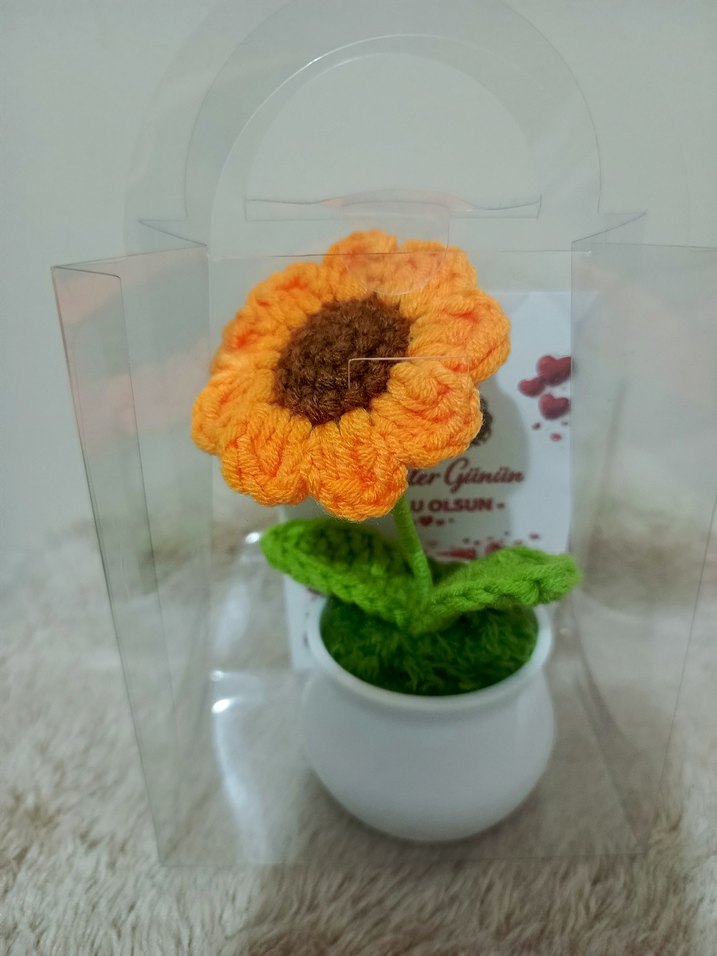 Beyaz saksıda, turuncu çiçek ve yeşil yapraklarla el yapımı bohem örgü çiçek. Dekoratif kullanım için uygun.