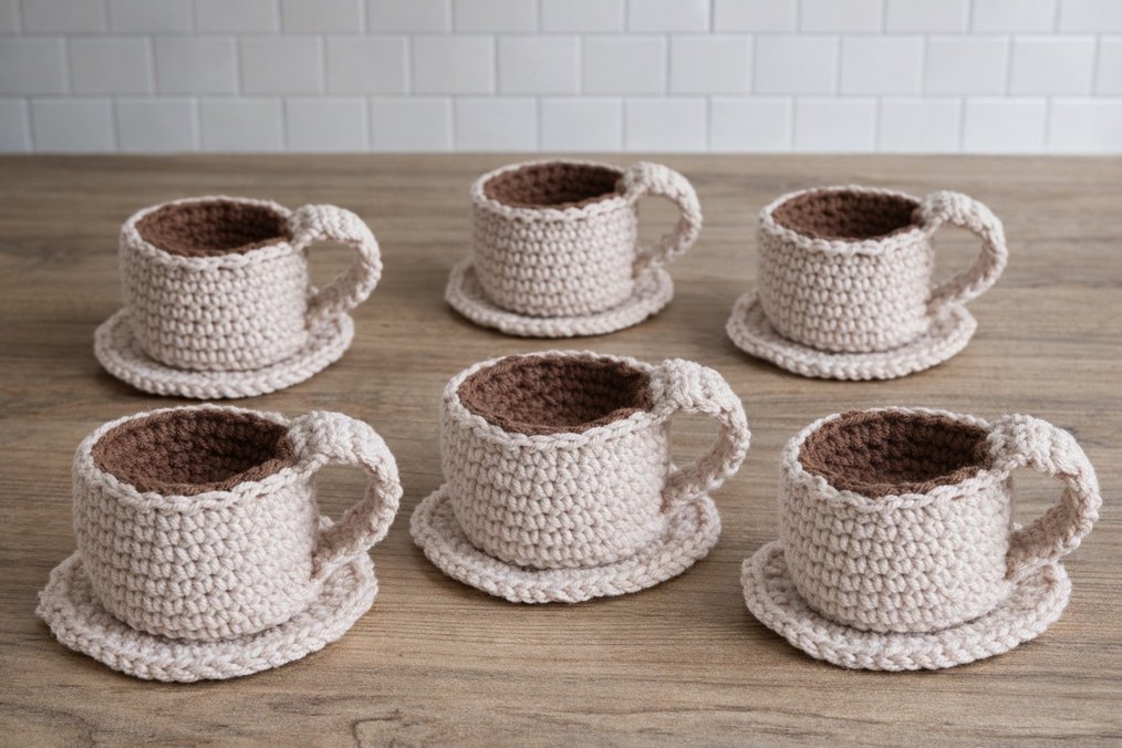 Yumuşak iplikten el yapımı bohem tarzda örgü fincanlar ve tabaklar, nötr tonlarda. Dekoratif veya özel kullanım için uygun. ☕️