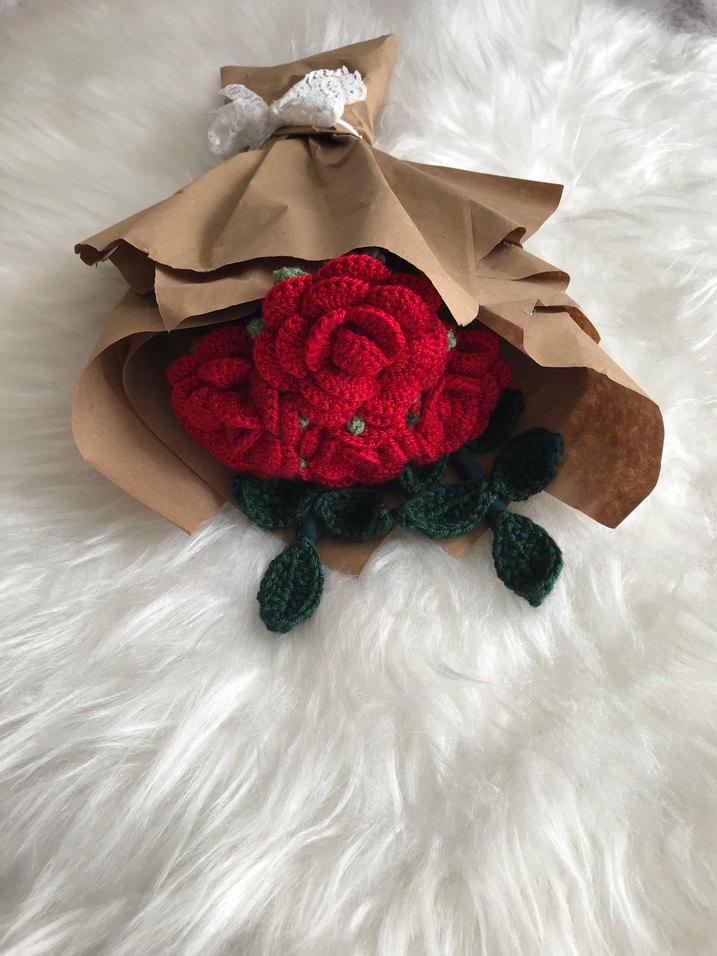 Bohem tarzda, el yapımı kırmızı örgü güller ve yeşil yapraklar kahverengi kağıda sarılmıştır.Öğretmenler günü İçin hediyelik çok zarif #öğretmenlergünü #hediye