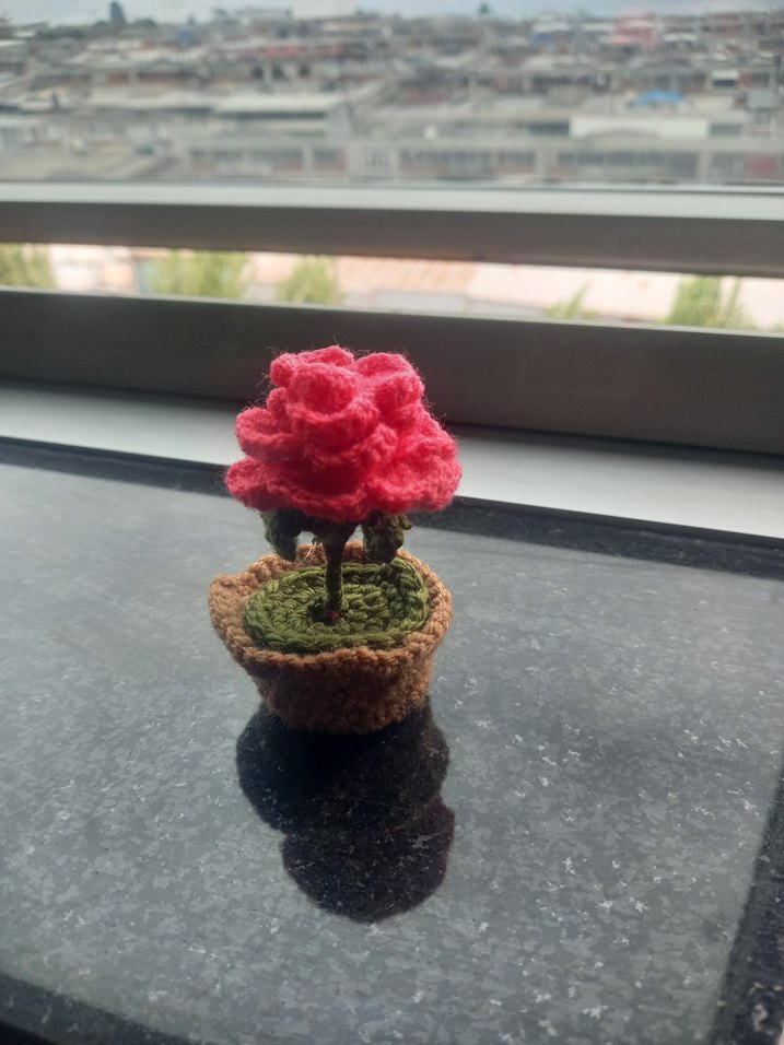 El yapımı bohem örgü gül çiçeği, küçük saksıda detaylı ip işiyle hazırlanmış, dekoratif amaçlıdır .